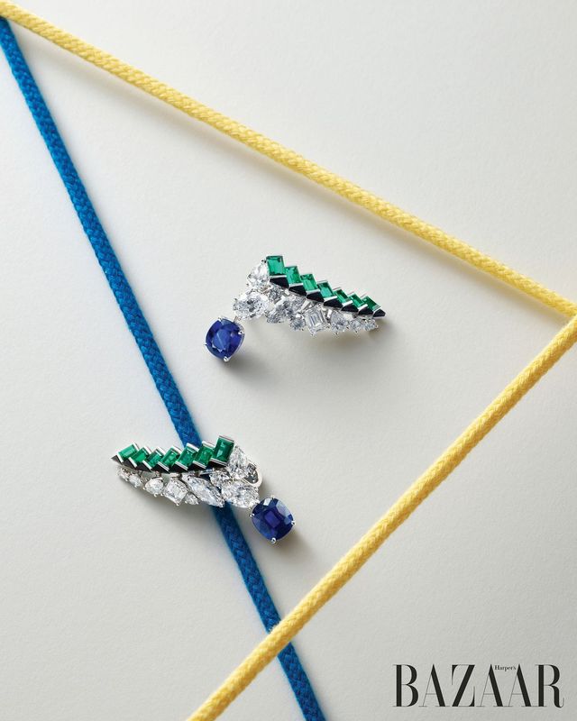 드롭 장식한 쿠션 컷 사파이어와 에메랄드, 오닉스, 다이아몬드의 배열이 조화로운 ‘그래픽 라인’ 이어링은 Chanel High Jewelry.