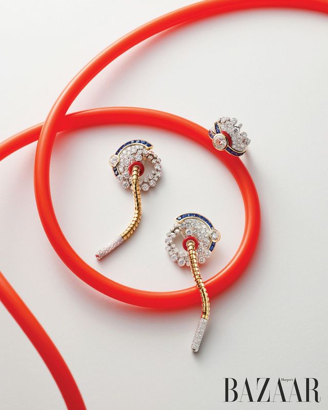 후디의 드로스트링을 연상케 하는 ‘스웨터’ 이어링, 2.01캐럿 브릴리언트 컷 다이아몬드와 사파이어, 다이아몬드, 레드 래커가 조화로운 ‘스웨터’ 링은 Chanel High Jewelry.