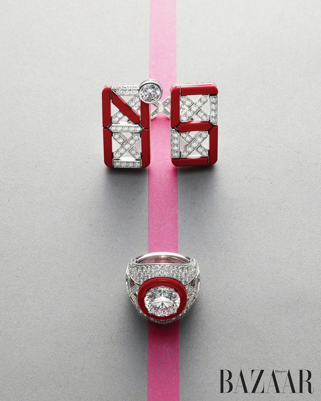 다이아몬드와 레드 래커로 아이코닉한 N°5를 표현한 ‘퀼티드 5’ 링, 5.05캐럿 브릴리언트 컷 다이아몬드를 중심으로 레드 래커와 다이아몬드를 세팅한 ‘퀼티드 2.55’ 링은 Chanel High Jewelry.