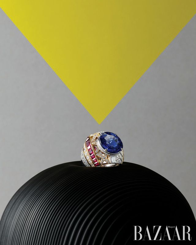 17.76캐럿 라운드 컷 사파이어를 중심으로 다이아몬드와 루비를 세팅한 ‘골드 슬라이더’ 링은 Chanel High Jewelry.