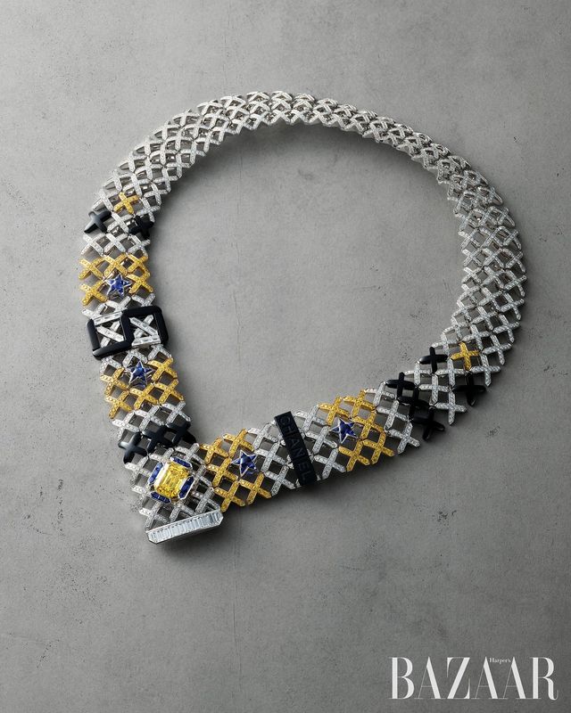 7.06캐럿 에메랄드 컷 옐로 다이아몬드 1개와 사파이어, 다이아몬드, 오닉스를 장식한 ‘퀼티드 스타’ 네크리스는 Chanel High Jewelry.