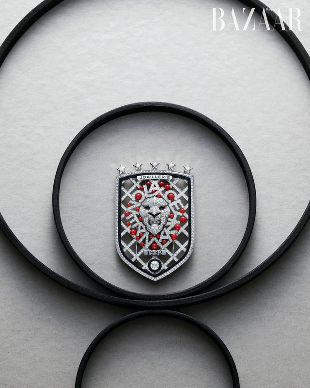 오픈 워크 형태의 엠블럼 디자인에 다이아몬드와 레드 래커, 블랙 래커로 사자 모티프를 구현한 ‘샤넬 프린트 리옹’ 브로치는 Chanel High Jewelry.