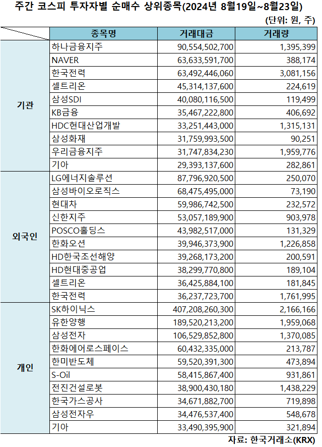 기관 '하나금융지주'·외인 'LG에너지솔루션'·개인 'SK하이닉스' 1위 [주간 코스피 순매수- 8월19일~8월23일]