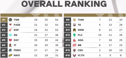 1일차 1위는 총합 54점을 획득한 TSM이 차지했고, 53점을 기록한 페이즈 클랜이 그 뒤를 이었다.