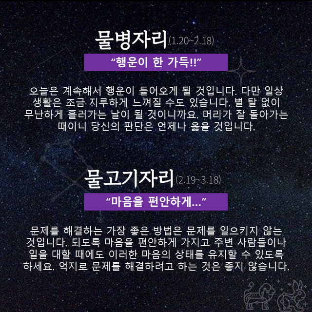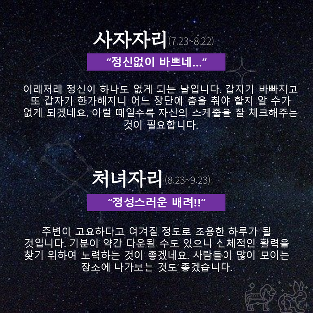 주변이 고요하다고 여겨질 정도로 조용한 하루가 될 것입니다. 기분이 약간 다운될 수도 있으니 신체적인 활력을 찾기 위하여 노력하는 것이 좋겠네요. 사람들이 많이 모이는 장소에 나가보는 것도 좋겠습니다.