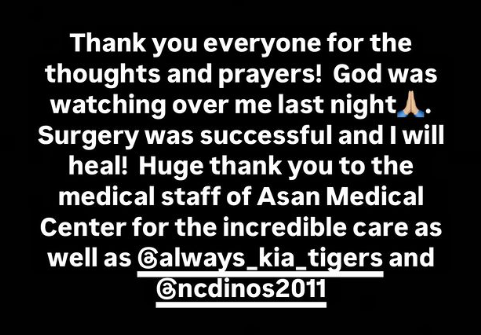 최근 한국 프로야구 KBO리그 경기 도중 강습 타구에 턱을 맞은 제임스 네일(31, KIA 타이거즈)이 수술 후 자신의 상태를 직접 알렸다.