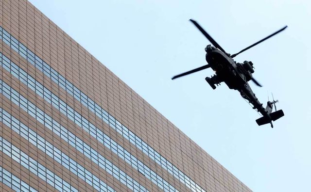 육군 아파치 헬기 편대가 14일 오후 서울 종로구 광화문광장 일대에서 국군의 날 시가행진 예행 연습을 위한 비행 훈련을 하고 있다. / 뉴스1