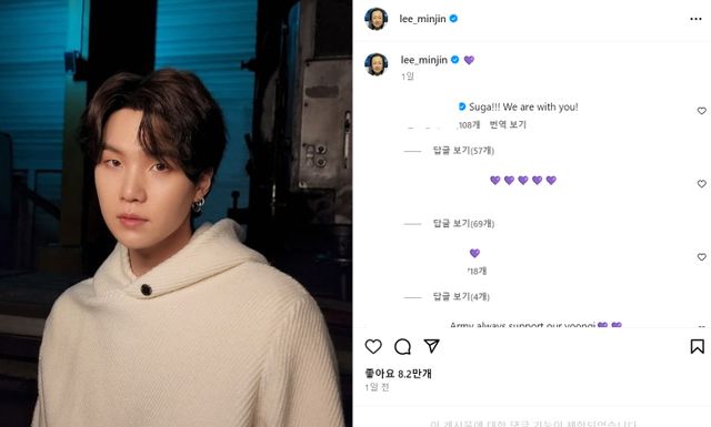 이민진 작가는 직접 슈가의 사진을 올리고 슈가의 개인 계정과 방탄소년단의 소속사인 빅히트 뮤직 계정을 태그했다.