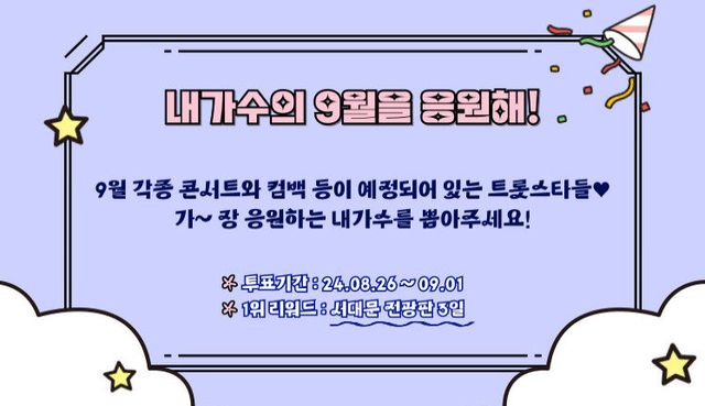오는 9월 단독쇼, 콘서트, 컴백 등의 트롯 관련 활동이 예정되어 있는 스타 가운데 가장 응원을 많이 받은 1위에게는 서대문 전광판 3일 서포트가 제공된다. 후보로는 김희재, 박서진, 이찬원, 임영웅 등이 선정됐다.