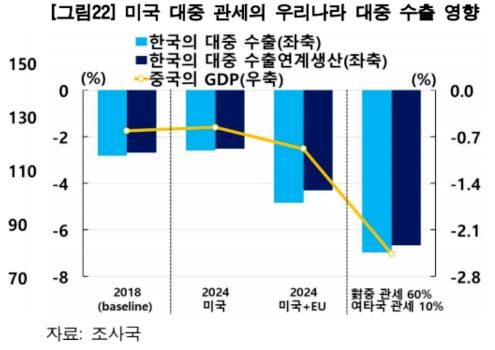 실제로 미국 정부가 발표한 대로 관세를 품목에 따라 25%~100%만큼 인상하거나 유럽연합(EU)이 동참하는 시나리오에서는 우리나라의 대중 수출이 3~5% 줄어드는 것으로 나타났다.