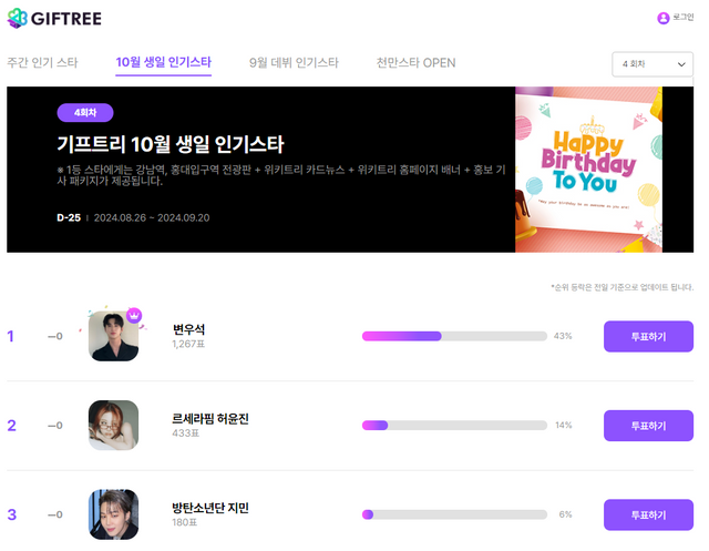 스타를 위한 신개념 팬 투표 서비스인 '기프트리' 에서 [10월 생일 인기스타] 투표를 진행하고 후보를 공개했다. 8월 26일부터 9월 20일까지 진행될 이번 투표에서는 1위를 차지하는 스타에게 풍성한 혜택을 제공한다.