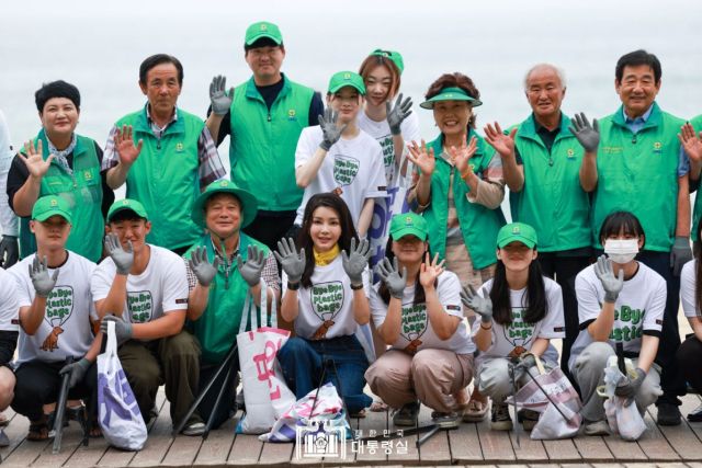 출범식 날도 영부인 김건희 씨가 등장했다. 김건희 씨는 대학교 환경동아리 대학생들과 함께 폐페트병을 활용해 제작한 티셔츠를 입었다. 퍼스트 도그 '새롬이'를 빼닮은 강아지가 티셔츠에 그려져 있었다. 이날 퍼스트 도그 '새롬이'도 김건희 씨와 함께 자리했다.