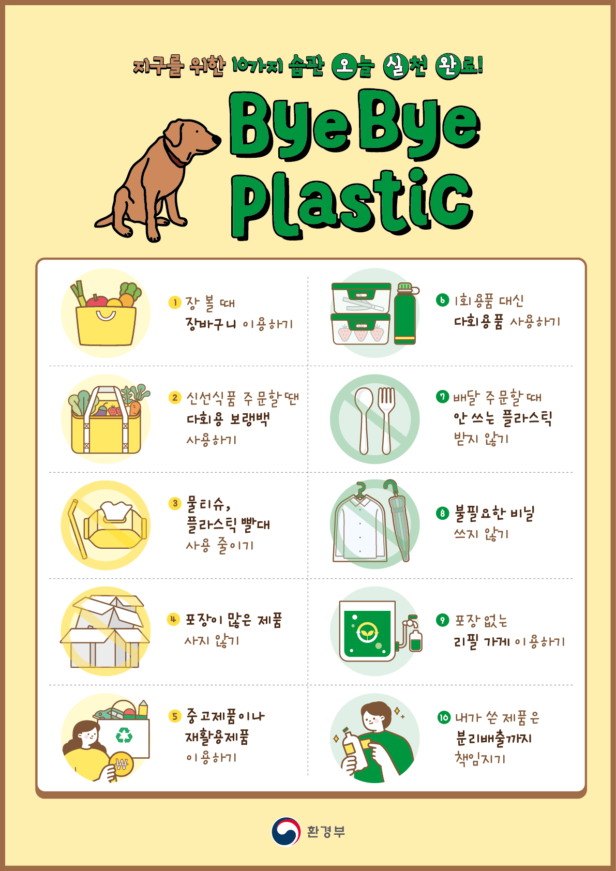 환경부는 지난해 6월 시작한 바이바이플라스틱 캠페인을, 8월부터 범국민 실천 운동으로 확대했다. 17개 광역 지자체에 강아지 도안이 그려진 티셔츠를 18장씩 나눠주며 캠페인 참여를 독려하기도 했다. 하지만 배부된 티셔츠는 캠페인 취지를 살린 폐페트병 소재 티셔츠가 아닌 일반 면 소재 티셔츠였다.
