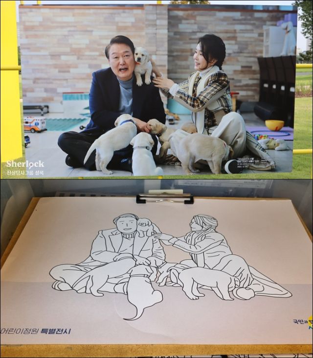 논란이 됐던 색칠놀이 도안은 윤 대통령 부부가 2022년 12월 안내견 학교에서 리트리버 강아지들과 시간을 보내는 모습이었다. 윤 대통령 부부는 이날 은퇴 안내견 '새롬이'를 입양했다. 바이바이플라스틱 캠페인 티셔츠에 도안으로 활용된 강아지와 꼭 닮았다.
