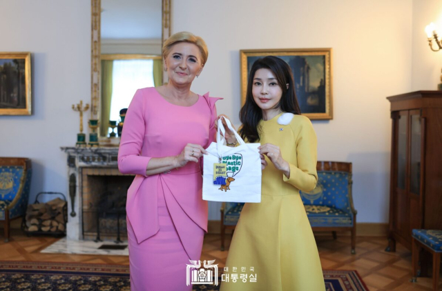 리투아니아·폴란드 순방길(2023. 7. 10.)에서도 김건희 씨는 강아지 도안이 그려진 에코백을 들고 나타났다. 폴란드 대통령 배우자와 친교 만남(2023. 7. 13.)에서는 강아지 도안이 그려진 에코백을 선물로 전달하기도 했다.