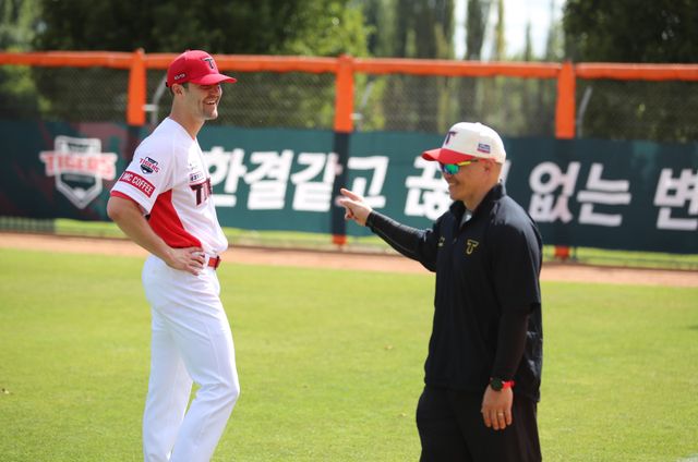 외국인 투수 제임스 네일과 박창민 KIA 총괄 트레이너. KIA 제공