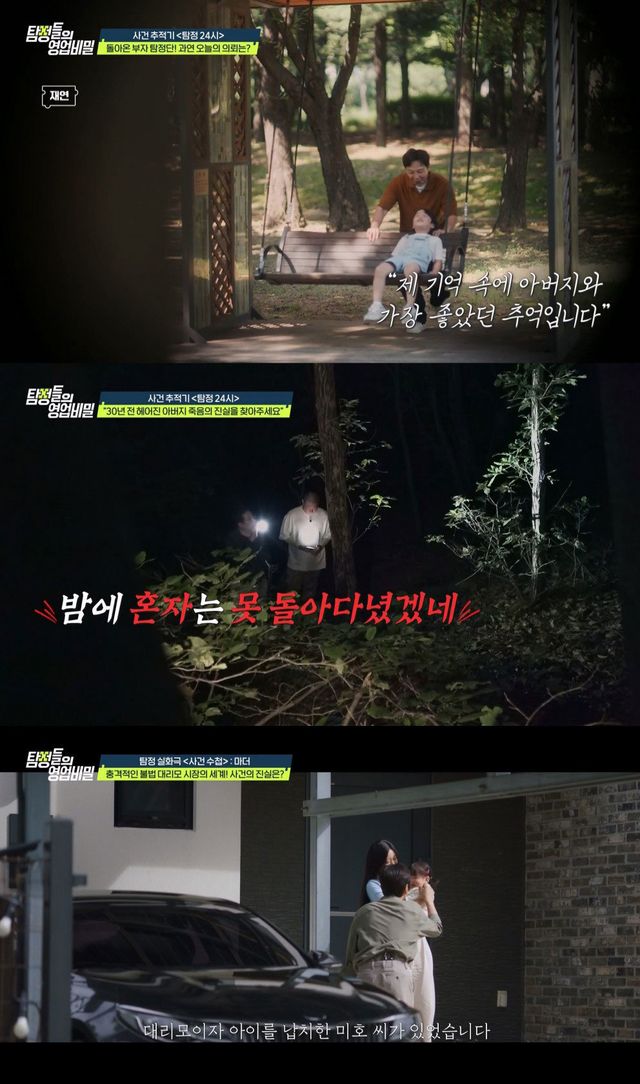 26일(월) 방송된 채널A ‘탐정들의 영업비밀’에서는 '부자 탐정단' 박민호&박준석 탐정이 30년 전 사망한 의뢰인 아버지의 '묘소 찾기 의뢰'에 착수했다. 제적기록부(현 가족관계증명서)에는 아버지가 인적이 드문 야산의 약수터에서 밤 12시경 사망한 것으로 기재되어 있었으나 사망 신고도 2주 뒤 시점이어서 의문을 더했다.