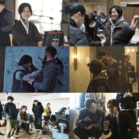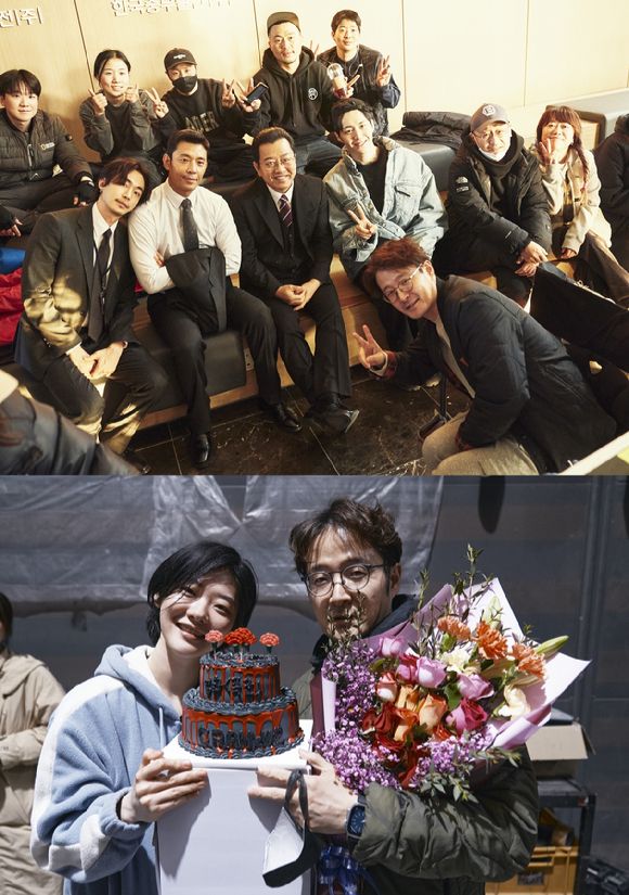 '최국장' 역의 김선호를 비롯해 '연모용' 역의 무진성, '사국장' 역의 김주헌, '1차장' 역의 이기영 등 극 중 서로를 날카롭게 견제하던 이들이 박훈정 감독, 스태프들과 모니터룸에 옹기종기 모인 모습에서 화기애애한 촬영 현장 분위기를 엿볼 수 있어 훈훈함을 자아낸다.