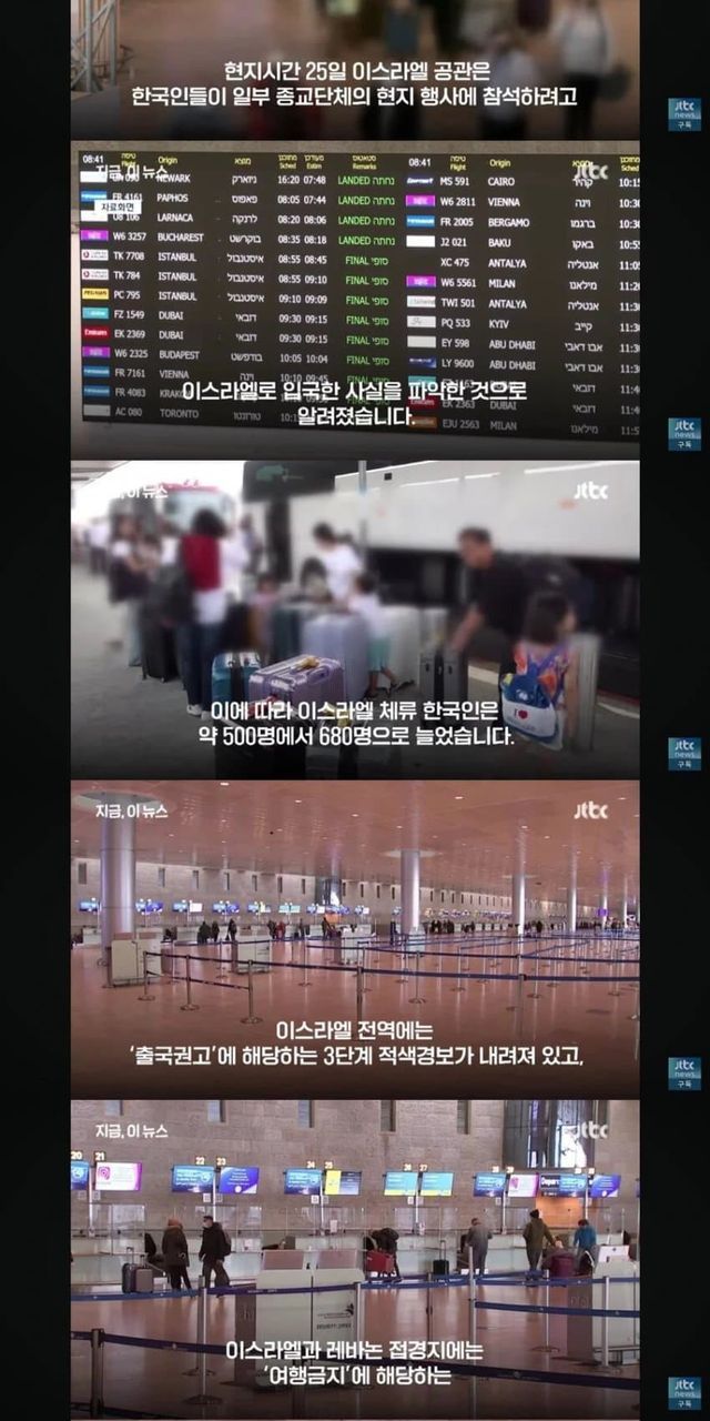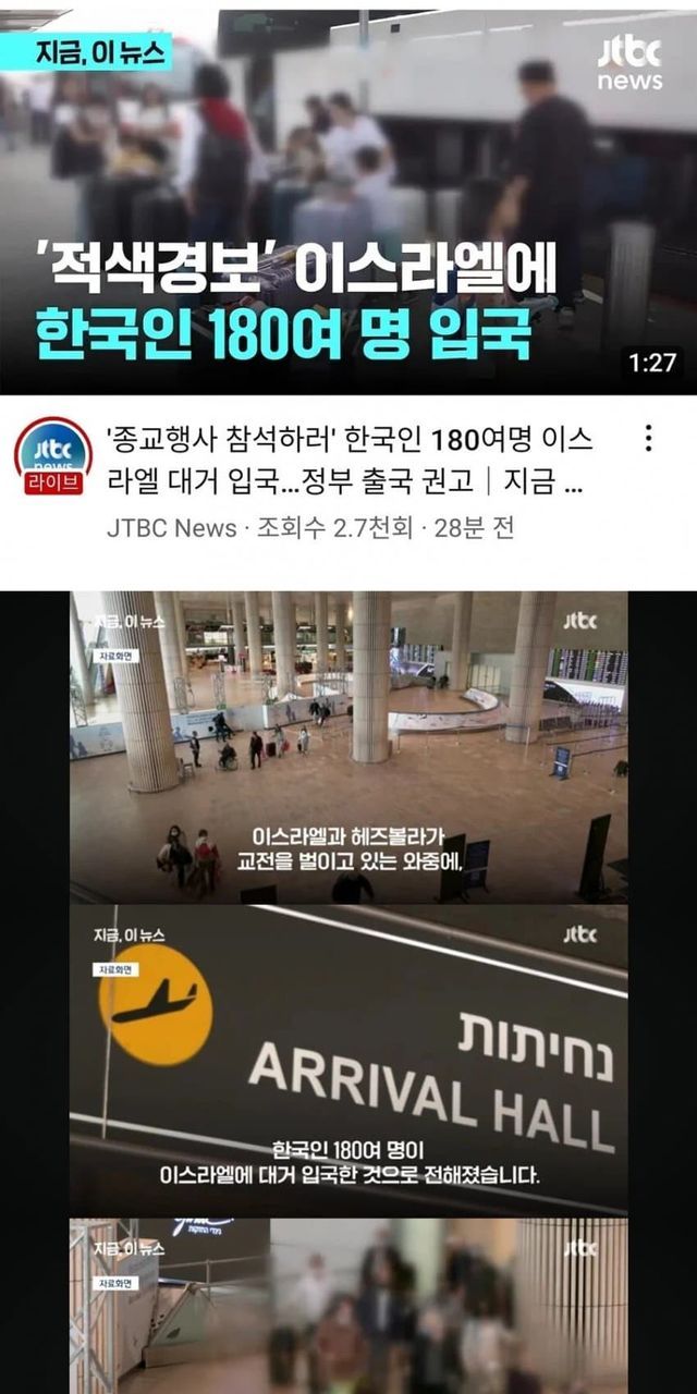 이스라엘과 레바논 무장정파 헤즈볼라가 정면 충돌해 긴장이 고조된 이스라엘에 우리 국민 180여 명이 종교행사 참석차 입국한 것으로 전해졌습니다. 이에 따라 이스라엘에 체류하는 한국인은 기존의 약 500명에서 680명으로 늘어났습니다. 정부는 현재 이스라엘 체류 재외국민에 대해 조속...