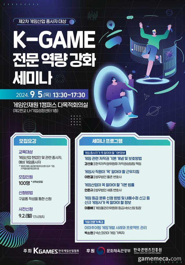 한국게임산업협회는 오는 9월 5일 오후 1시 30분부터 판교 게임인재원 1캠퍼스 다목적회의실(제2판교 LH기업성장센터 1층)에서 제2차 게임산업 종사자 대상 K-GAME 전문 역량 강화 세미나를 개최한다.