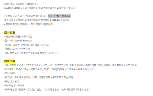 한편, 기프트리는 8월 26일부터 9월 1일까지 2호선 강남역, 홍대입구역 전광판에 노출될 광고 영상물을 공모 받고 있다. 예준을 응원하는 팬이라면 누구나 자유롭게 제작하여 접수할 수 있다.