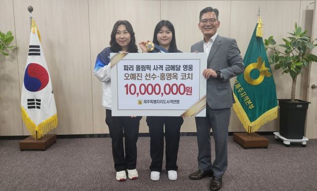 [한라일보] 제주도사격연맹(회장 윤재춘)은 파리올림픽에서 금메달을 명중한 오예진 선수와 홍영옥 코치에게 26일 포상금을 전달했다고 27일 밝혔다.