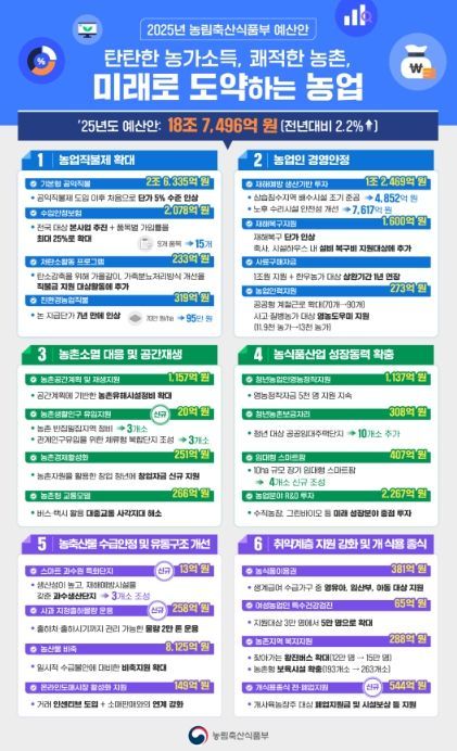 농식품부는 농업인 소득·경영안전망 강화, 농촌소멸 대응 및 공간 재생, 농식품산업 성장동력 확충, 농축산물 수급안정 및 식량안보 강화 등 주요 농정과제 성과 창출을 위한 분야에 2025년 예산을 중점 투자할 계획이다.