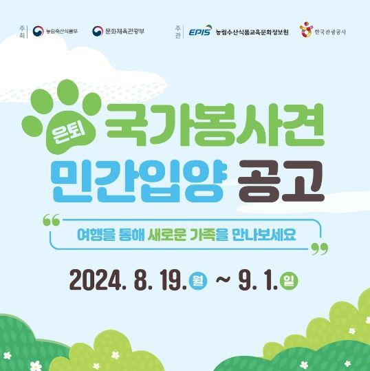 국가와 국민의 안전을 위해 헌신한 은퇴 봉사견들이 남은 견생을 새로운 가족과 만나 안락한 삶을 누릴 수 있도록 농식품부와 문화체육관광부가 주최하고 농정원과 한국관광공사가 주관하는 '은퇴 국가봉사견 민간 입양 공고'를 실시합니다.