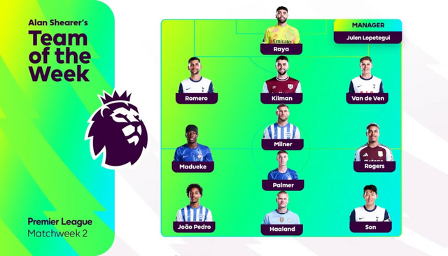 26일 앨런 시어러 선정 2024~25 EPL 2라운드 베스트11. 직전 에버턴전에서 멀티 골을 쏘아 올린 손흥민이 홀란, 페드로와 함께 전방에 배치됐다. 사진=EPL 홈페이지