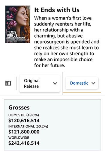 전 세계 글로벌 역주행 신화를 일으킨 동명의 베스트셀러를 원작으로 한 영화 ‘우리가 끝이야’가 전 세계 극장가에 파란을 일으키며 새로운 흥행 강자로 주목받고 있다. 개봉과 동시에 ‘데드풀과 울버린’, ‘트위스터스’ 등 할리우드 대작들을 뛰어넘고 북미 오프닝 박스오피스 1위에 오르며 흥행 복병으로 떠오른 ‘우리가 끝이야’는 이어 전 세계 극장가를 차례로 강타하기 시작, 월드 와이드 흥행 수익 2억 4200만 달러(한화 약 3217억원)를 돌파하며 2018년 이후 가장 흥행한 로맨스 드라마 영화에 이름을 올렸다. 이는 배우 브래들리 쿠퍼와 레이디 가가 주연의 ‘스타 이즈 본’ 이후 가장 많은 사랑을 받은 로맨스 드라마로 더욱 눈길을 사로잡는다.