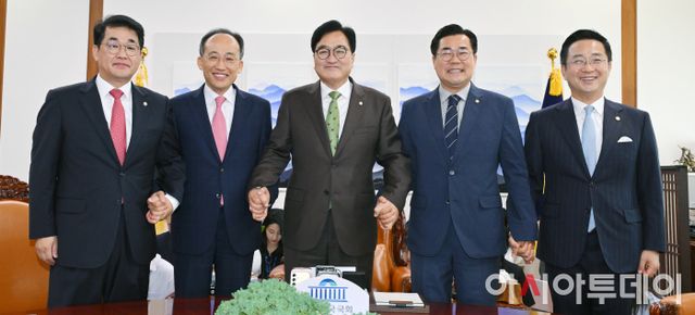 아시아투데이 이병화 기자 = 우원식 국회의장과 추경호 국민의힘 원내대표, 박찬대 더불어민주당 원내대표가 28일 국회에서 열린 국회의장 주재 양당 원내대표 회동에 앞서 기념촬영을 하고 있다. 왼쪽부터 배준영 국민의힘 원내수석부대표, 추경호 원내대표, 우원식 국회의장, 박찬대 더불어민주당 원내대표, 박성준 원내수석부대표.