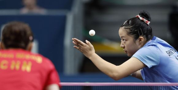 신유빈이 2일(현지시각) 프랑스 파리 사우스 파리 아레나4에서 열린 2024 파리올림픽 탁구 여자 단식 준결승전에서 중국 천멍을 상대로 서브를 넣고 있다. [사진=뉴시스]