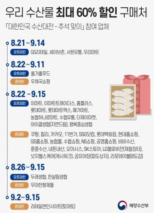 전국 42개 마트, 온라인몰 등에서 ‘대한민국 수산대전 - 추석 특별전’을 진행하고 있다. 이번 행사는 대중성 어종(명태, 고등어, 갈치, 오징어, 참조기, 마른멸치 등)과 전복 등 소비자 선호도가 높고 소비촉진이 필요한 수산물 최대 13종*에 대해 진행하며, 60%까지 할인된 가격으로 수산물을 구매할 수 있다.