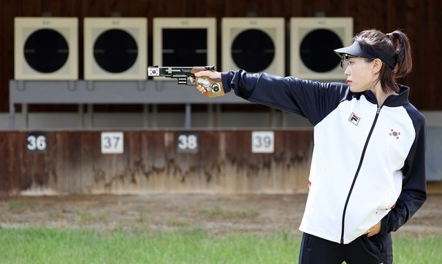 25m 권총에 출전하는 사격 대표팀 김예지가 지난 5월 27일 충북 진천국가대표선수촌에서 열린 '제33회 파리 올림픽 사격 국가대표 미디어데이' 훈련에 앞서 자세를 취해보고 있다. / 뉴스1