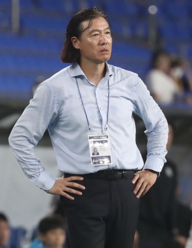 28일 오후 울산 문수축구경기장에서 열린 프로축구 '2024 하나은행 코리아컵' 4강 2차전 울산 HD와 광주 FC의 경기에서 울산 김판곤 감독이 경기를 지켜보고 있다. / 뉴스1