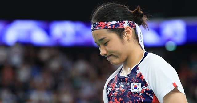대한민국 배드민턴 대표팀 안세영이 지난 5일 오후(한국 시각) 프랑스 파리 라 샤펠 아레나에서 열린 2024 파리올림픽 배드민턴 여자 단식 결승 중국의 허빙자오 선수와의 경기에서 실점한 후 아쉬워하고 있다. / 뉴스1