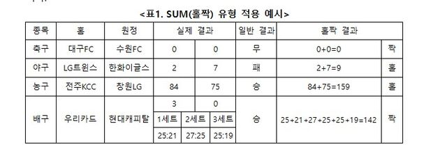 'SUM' 유형 게임 참여 시 반드시 유의해야 할 점은, 게임에 참여할 때 스코어 결과가 ‘홀’로 예상되면 ‘승’으로 기표해야 하며, ‘짝’으로 예상되면 ‘패’로 기표해야 한다. 또한, 양 팀 최종 점수의 합이 ‘0’일 경우에는 ‘짝’으로 인정해서 ‘패’로 기표해야 한다는 점도 유의해야 한다. <표1> 에 나열되어 있는 경기를 예를 들어 설명하자면, 축구 경기에서 대구FC와 수원FC가 0-0으로 경기를 마친 경우, 결과는 '짝'이 되며 투표용지에 ‘패’로 기표한 경우에 적중된다. 농구 경기에서 전주KCC(84점)와 창원LG(75점)의 점수 합이 159점이라면 이는 '홀'에 해당하며 ‘승’에 기표한 경우 적중이 된다.