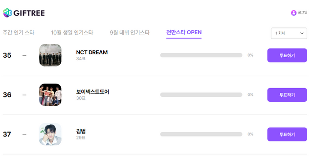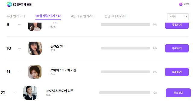 기프트리 10월 생일 인기스타 화면 / 기프트리
