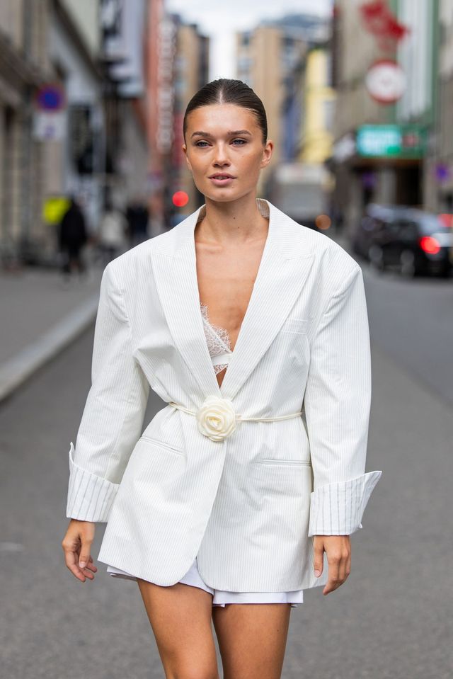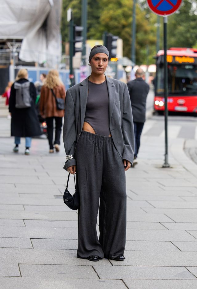 오버사이즈 재킷과 매치한 센슈얼한 보디슈트, 와이드 팬츠부터 헤드밴드까지, 예측 불가능한 믹스 매치가 돋보이는 스타일입니다. 모두 그레이 톤으로 맞춰 통일감을 준 것이 포인트!