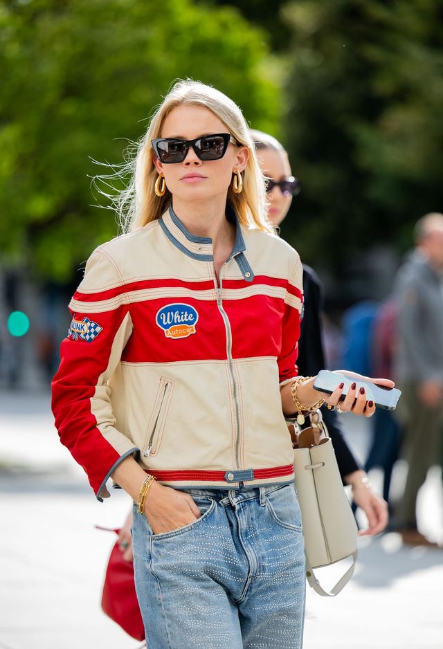 경쾌한 컬러감이 돋보이는 레이싱 재킷을 데님 팬츠와 매치한