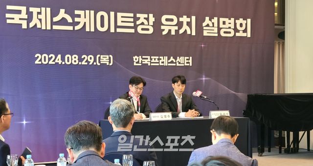 29일 서울 중구 프레스센터 프레스클럽에서 ‘김포 국제스케이트장 유치 설명회’가 열렸다. 이는 지난 3월 국제스케이트장 유치에 도전장을 내민 7개 지자체(강원 춘천·원주·철원, 경기 양주·동두천·김포, 인천 서구) 중, 처음으로 열린 설명회다. 2년 전 문화재청(현 국가유산청)은 태릉의 조선왕릉이 세계문화유산으로 등재돼 일부 시설만 존치하고 스케이트장은 2027년 철거 예정이라고 밝힌 바 있다.
