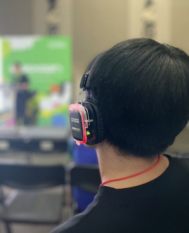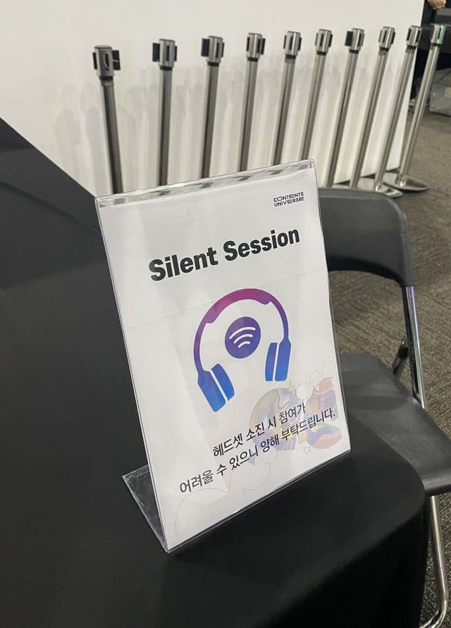 29일 경기도 고양 킨텍스(2전시장 6홀)에서 열린 ‘2024 콘텐츠유니버스 코리아’ 커넥트허브, 데크포리아에서 열리는 프로그램은 ‘사일런트 세션’(Silent Session)으로 운영 중이다. 강연 및 프로그램에 한층 집중할 수 있도록 노이즈 캔슬링 기능을 더한 헤드셋을 지급해 집중도를 높였다.