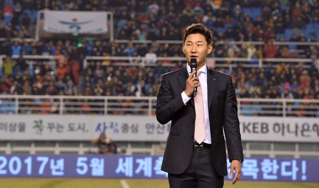 2016년 3월 24일 오후 경기도 안산시 단원구 와스타디움에서 열린 남자축구대표팀 러시아월드컵 아시아 2차 예선 대한민국과 레바논의 경기에서 지난해 선수 생활을 은퇴한 이천수(35)가 은퇴식을 하고 있다. / 뉴스1
