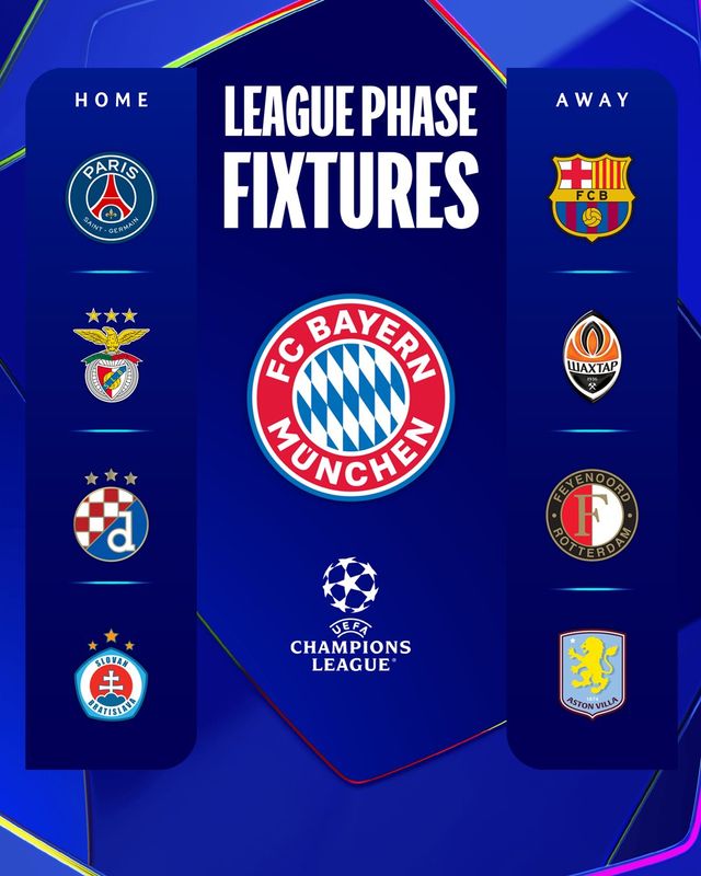 뮌헨은 1포트에서 PSG를 비롯해 바르셀로나(스페인, 원정)를 상대한다. 2포트에선 벤피카(포르투갈, 홈), 샤흐타르 도네츠크(우크라니아, 원정)를 만나고 3포트에선 디나모 자그레브(크로아티아, 홈), 페예노르트(네덜란드, 원정)를 상대한다. 4포트에선 브라티슬라바(슬로바키아, 홈), 애스턴 빌라(잉글랜드, 원정)와 격돌한다.