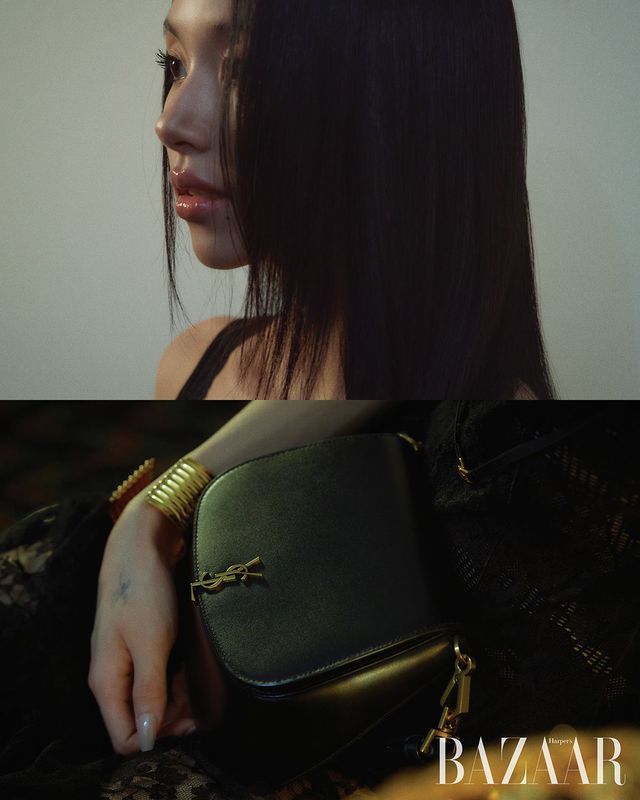 드레스, 뱅글, 카프 스킨 소재의 ‘볼테르 미니 톱 핸들’ 백은 모두 Saint Laurent by Anthony Vaccarello.