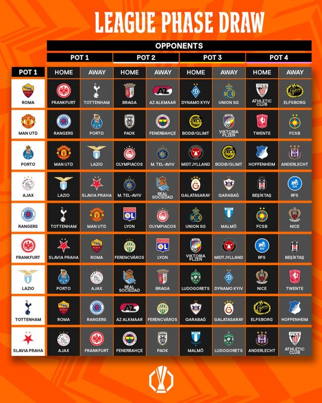 맨유는 레인저스, 포르투(이상 포트1), PAOK(그리스), 페네르바체(이상 포트2), 보되/글림트(노르웨이), 빅토리아 플젠(체코·이상 포트3), 트벤테(네덜란드), FCSB(이상 포트4)와 대진이 구성됐다.