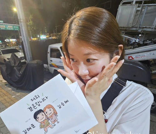 사진에는 '꽃받침' 포즈로 부끄러움을 드러내는 김승혜가 담겨 있으며, 홍윤화는 막 받은 청첩장을 바로 앞에서 자랑하고 있다.