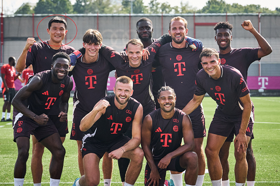 세 선수 외에도 알폰소 데이비스, 세르주 그나브리, 주앙 팔리냐, 마누엘 노이어, 해리 케인, 킹슬리 코망, 하비에르 페르난데스가 함께 포즈를 취했다. 팀 훈련 중 진행한 미니게임에서 김민재를 포함한 10명의 선수들이 승리를 거둔 것으로 추정된다.