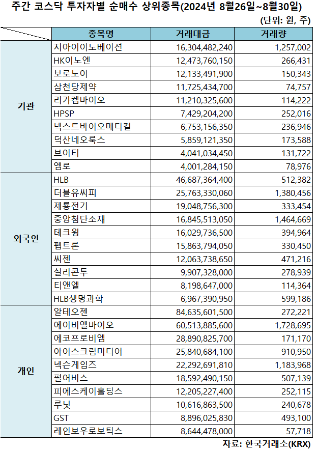 기관 '지아이이노베이션'·외인 'HLB'·개인 '알테오젠' 1위 [주간 코스닥 순매수- 8월26일~8월30일]