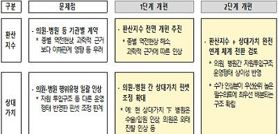 이러한 불균형을 해소하기 위해 환산지수와 상대가치점수 결정방식을 근본적으로 개편하는 방안을 내년까지 마련하여 시행할 수 있도록 추진한다.